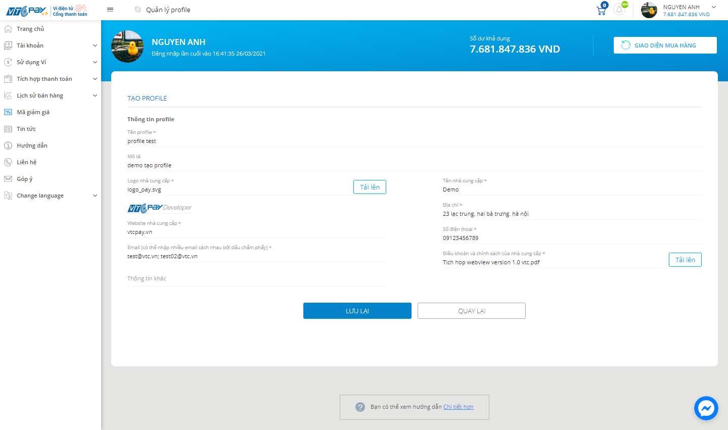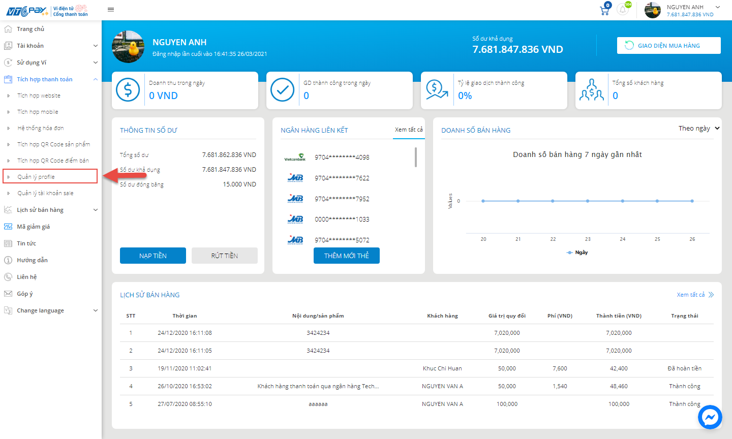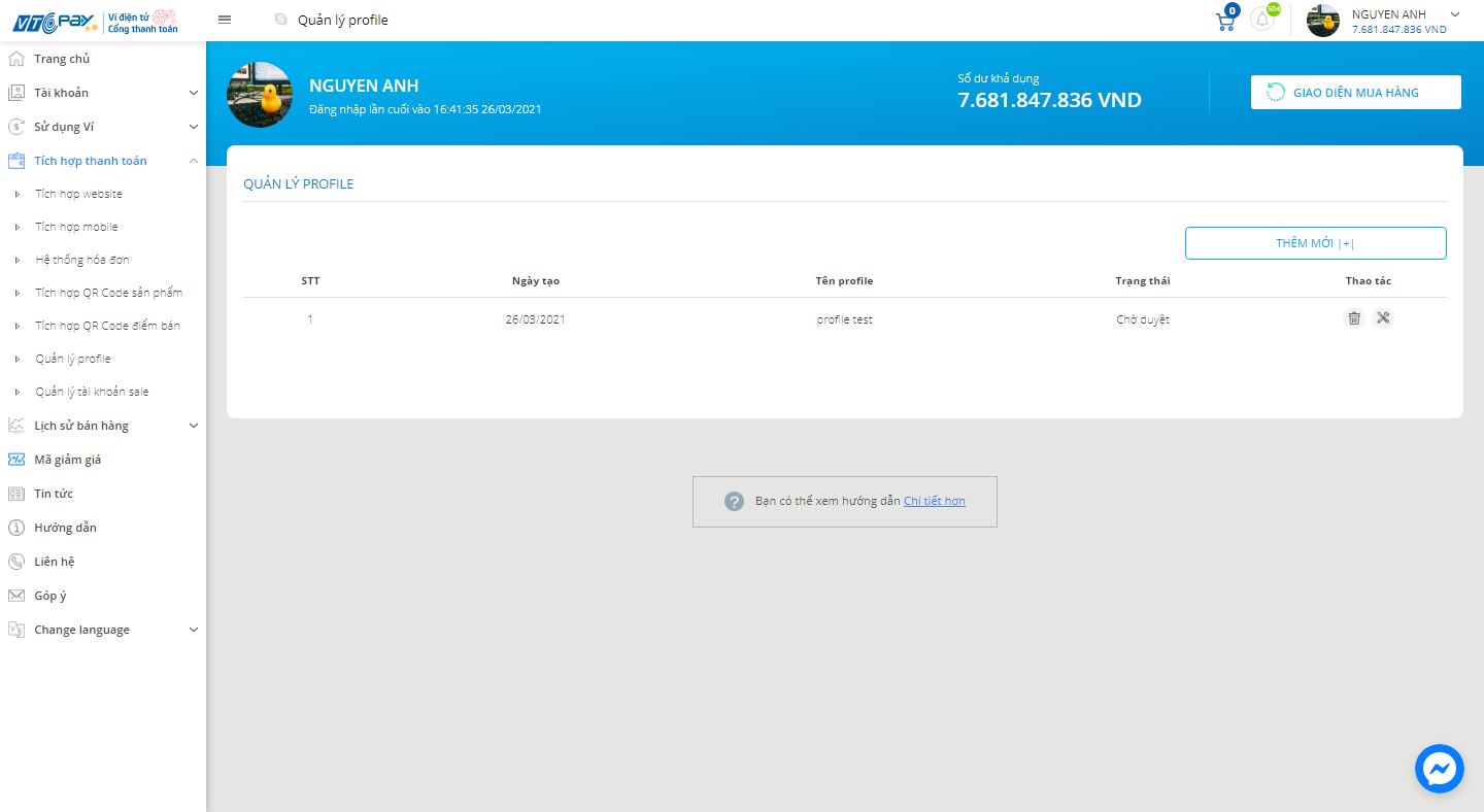 Đối với tài khoản Merchant trên môi trường test được cung cấp, đã có sẵn các profile nên Merchant không cần tạo mới profile cho tài khoản. Tuy nhiên khi tích hợp trên môi trường thật, Merchant cần tạo được profile cho tài khoản trước khi có thể tiến hành tạo và đăng ký tích hợp website . Tham khảo mục HƯỚNG DẪN TẠO PROFILE CHO TÀI KHOẢN MERCHANT!